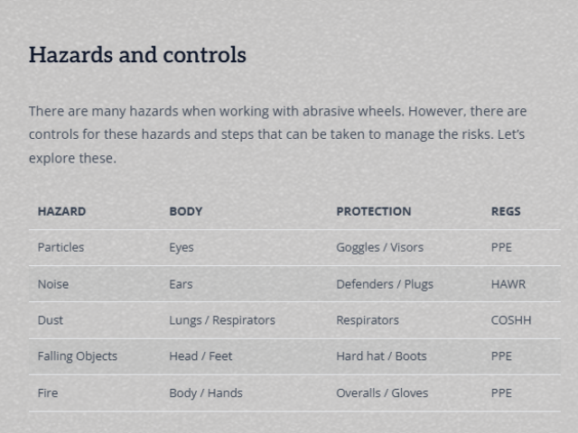 • Recognise abrasive wheel hazards and how to reduce risks with control measures