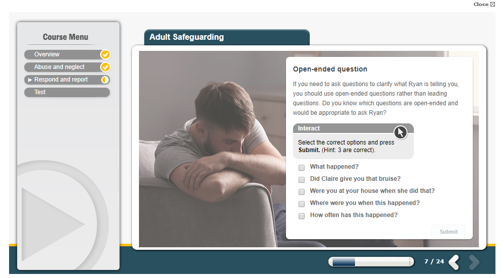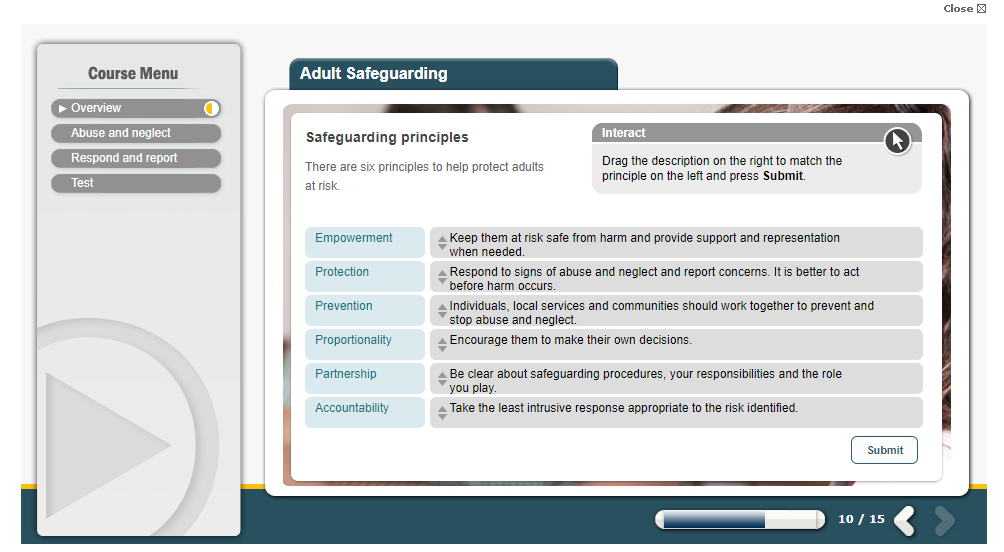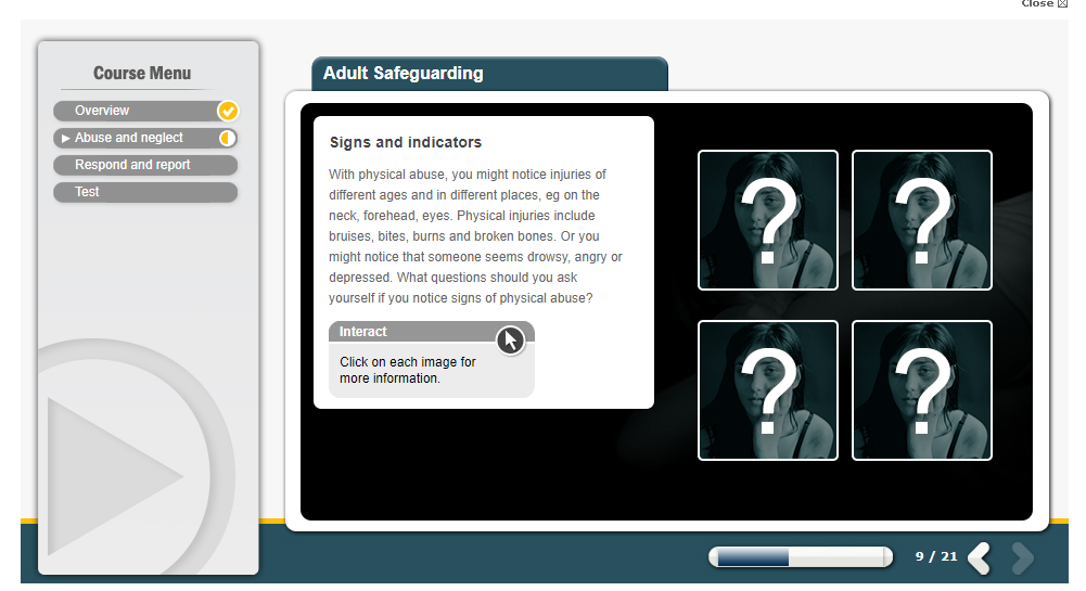 The online Adult Safeguarding course will explain what safeguarding is and your role in this process. Through the course you will learn how to recognise signs of abuse and neglect in vulnerable adults and how to respond and report safeguarding concerns.