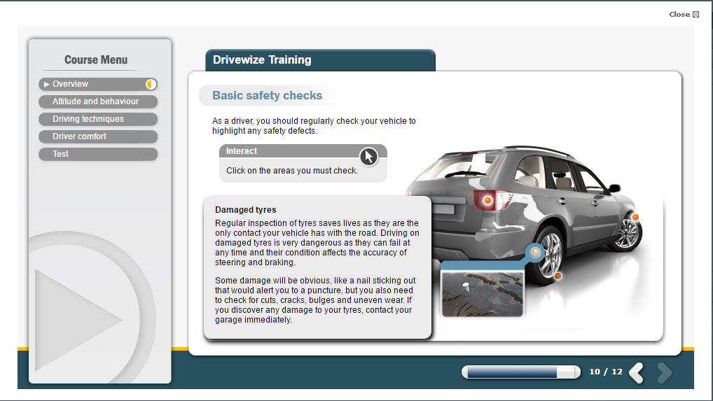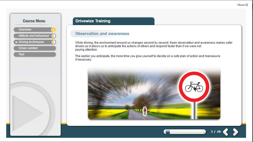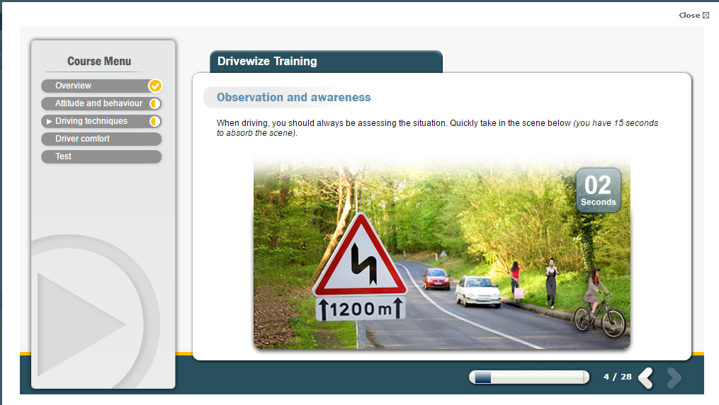 Our Driving Safely eLearning course aims to increase a user’s awareness of how their behaviour on the road can affect how safely they are driving.