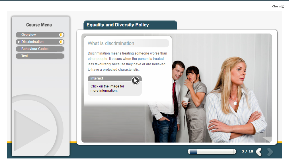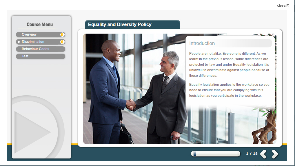 The Equality and Diversity eLearning course covers the importance of the Equality Act 2010 in the workplace and highlights the need to ensure that discriminatory practices are avoided, both through actions and words.