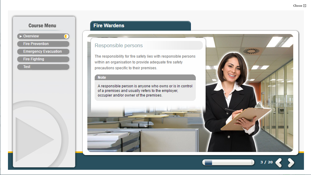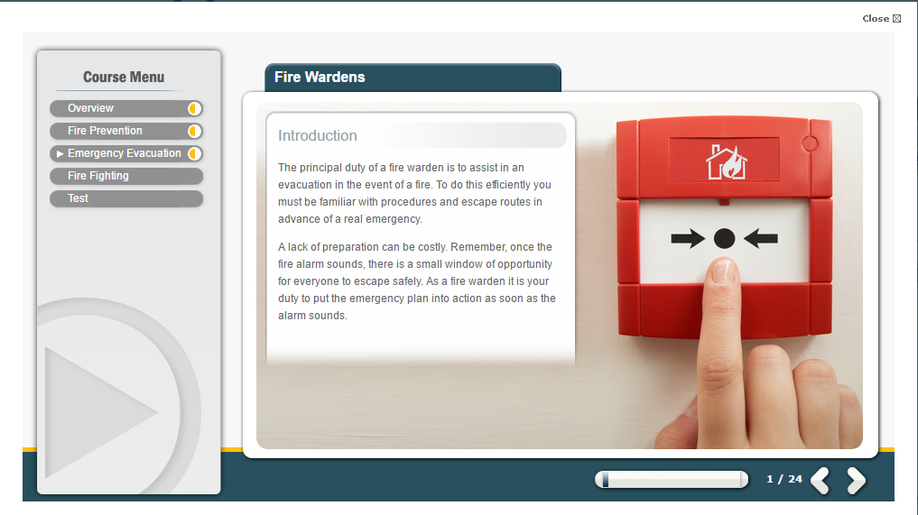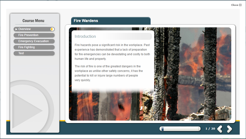 This Fire Warden eLearning course details Fire Warden duties and responsibilities, how fires start and what to do in the event of a fire.