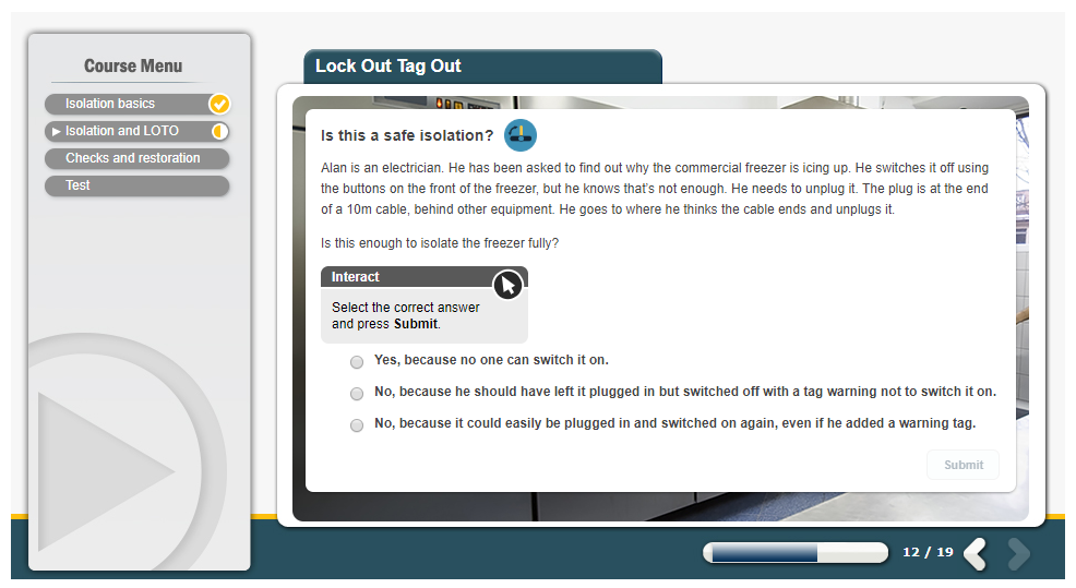 Where the lock out, tag out procedure is a significant element of an individual’s job role, it is recommended that this course is used as part of a blended learning approach, for example as preparation for a skills-based practical course or as a refresher of the key points.