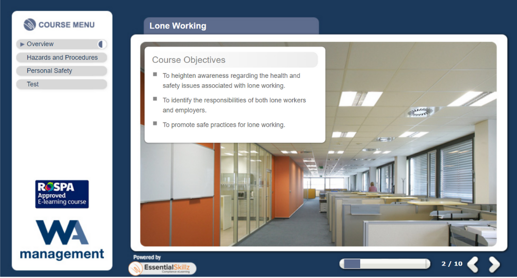 The online Lone Working training course is ideal for managers or any employees who will be involved in lone working, as well as senior management who would like to ensure lone worker safety. This course would also be useful for anyone who works at home or remotely. If you are interested in this, check out our Home Working Online Training Course as well!