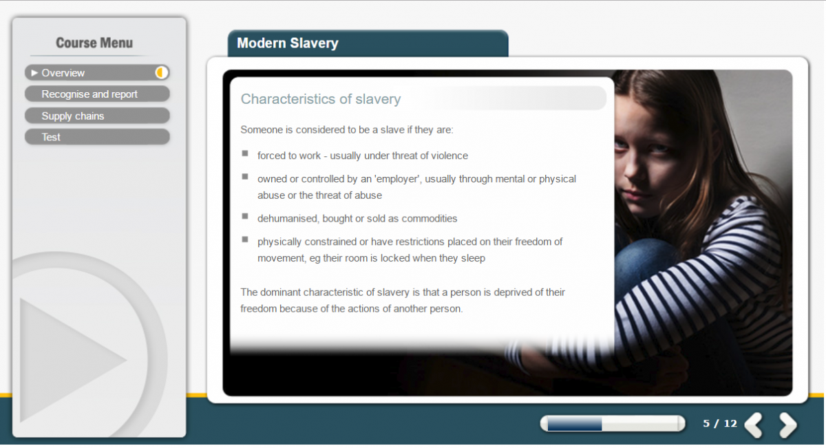 The Modern Day Slavery training is an interactive course which defines Modern Slavery and explains the different forms of contemporary slavery. It successfully provides the information your employees need to identify slavery in society and in your organisation. Additionally, delegates are provided with guidelines to promote good business practice and how to safely report cases of exploitation.