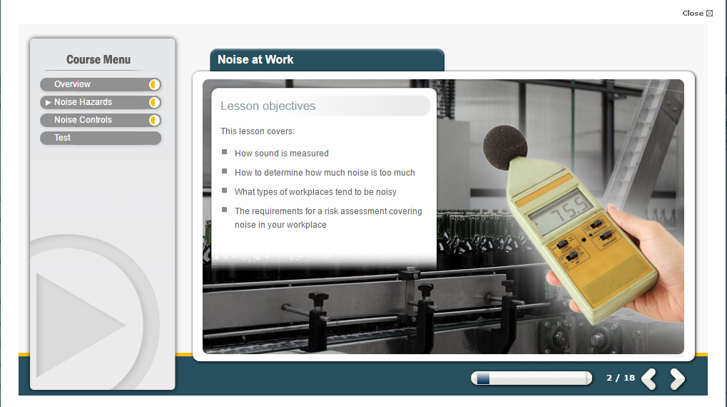 This Online Noise at Work course is appropriate for all employers and employees who work in a noisy environment or with noisy equipment and is designed to raise awareness of the risks associated with noise in the workplace. This course is also suitable as part of a new starter health and safety induction. Please Note This e-learning course only provides awareness education. A full workplace Noise Risk Assessment should be carried out with a calibrated noise metre.   If you are interested in this, check out our DSE Online Training Course as well!