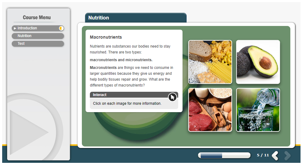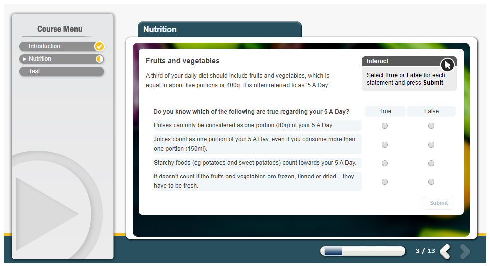 Good nutrition means obtaining the food necessary for health and growth. The Nutrition Awareness online training course looks at what constitutes a healthy balanced diet, identifies healthy foods and how much of each food group you should eat and what foods you should avoid. Sometimes foods we might think are healthy can be full of extra sugar or salt. The course outlines the recommended limits for how much sugar and salt you should consume in a day and shows you how to recognise foods that might contain excess amounts. Hydration is an equally important element of a healthy diet, so the course includes information on how much liquid you should drink each day, what types of liquids count towards the daily recommendation, and how dehydration can negatively affect your body.