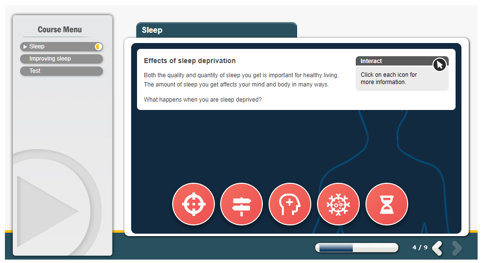 Sleep is essential to being able to function in your day-to-day life. This online Sleep Awareness training course builds on the information provided in our Healthy Living Awareness course and is designed to help you understand how sleep contributes to your overall health and wellbeing. The course outlines some easy-to-implement tips to help you get a better night’s sleep. These range from changing your sleeping environment and implementing a consistent routine, to being physically active every day. Stress is also a well-known sleep disruptor. In itself stress can lead to physical and mental health issues. However, if stress also deprives you of sleep, it could intensify these, and cause further harm. This course helps you recognise when you might be stressed and suggests some techniques for managing stress effectively and how to sleep better with anxiety, so that you fall asleep faster and achieve better quality sleep.