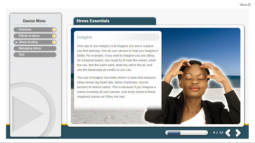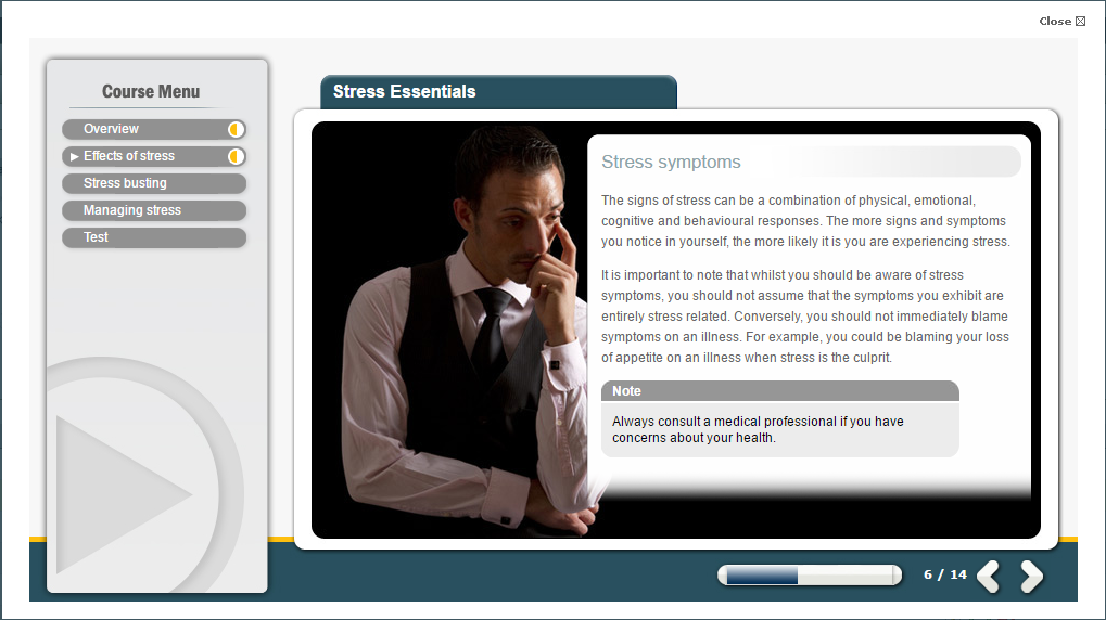 This online Stress Awareness course defines the terms ‘pressure’ and ‘stress’ and explains the difference in acute and chronic stress conditions.  Users will learn what the main causes of stress are, but these may be a subjective experience and what one person finds stressful, another may not.  Additionally, the course explains how the reactions we have to stressful situations are affected by our personalities, our physical, intellectual and emotional abilities and our view of the stressor. The symptoms of stress are discussed in this training module which can be a combination of physical, emotional, cognitive and behavioural responses.  Also, this Stress awareness training highlights how the effects of stress are linked to the development of specific disorders and health problems. Furthermore, the course introduces stress busting techniques that help to reduce the build-up of daily stress.  Users will learn that it is important to take personal responsibility for managing their personal stress levels and where they can find help and advice.