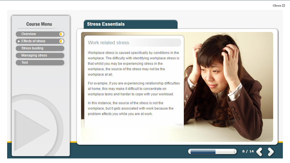 This Stress Awareness online course looks at the causes of stress, the effects of stress and ways of controlling and resolving stress, both in the workplace and at home.